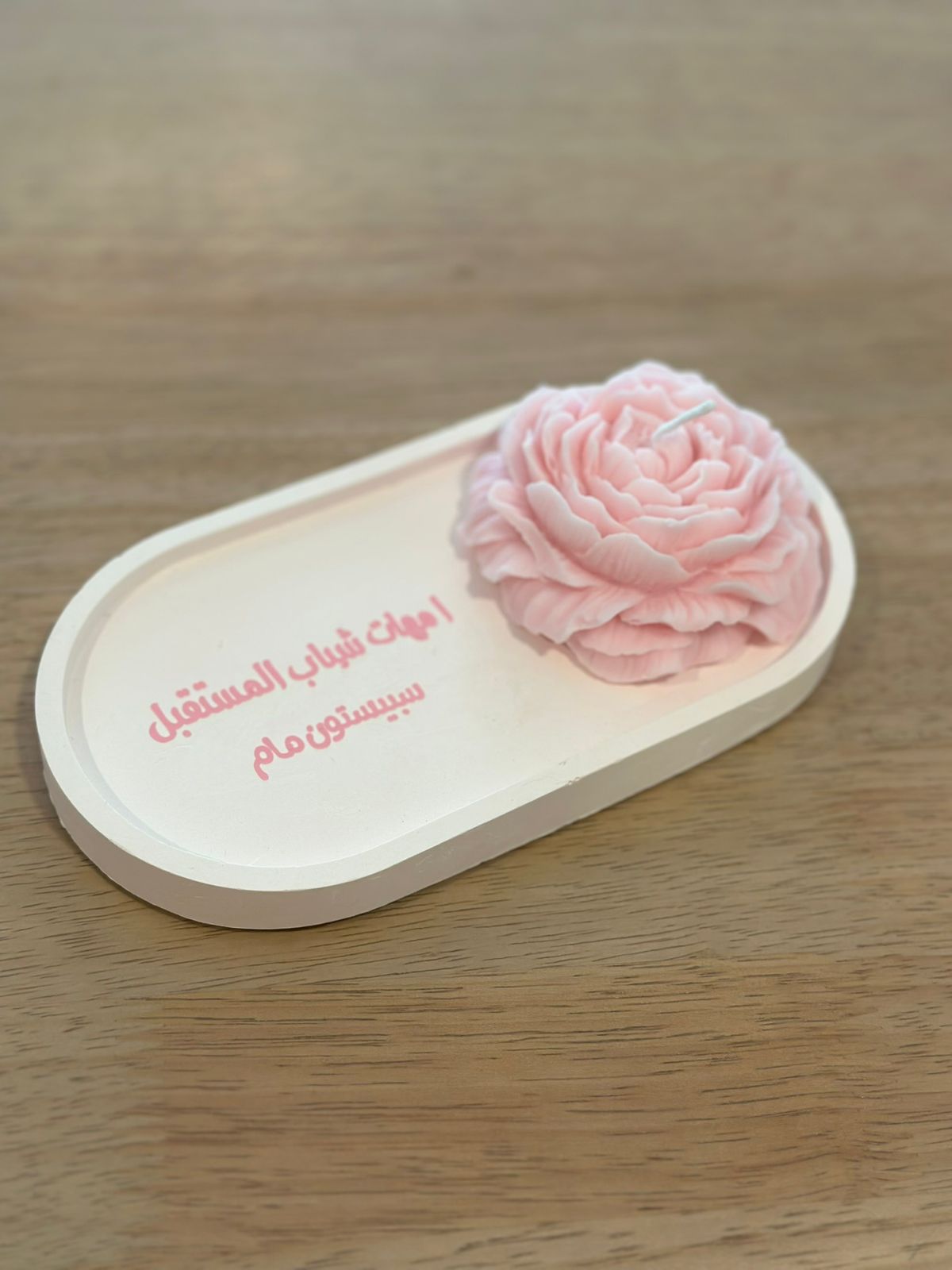 A pretty flower candle on a handmade concrete plate. Perfect for decorating your home or giving as a gift.